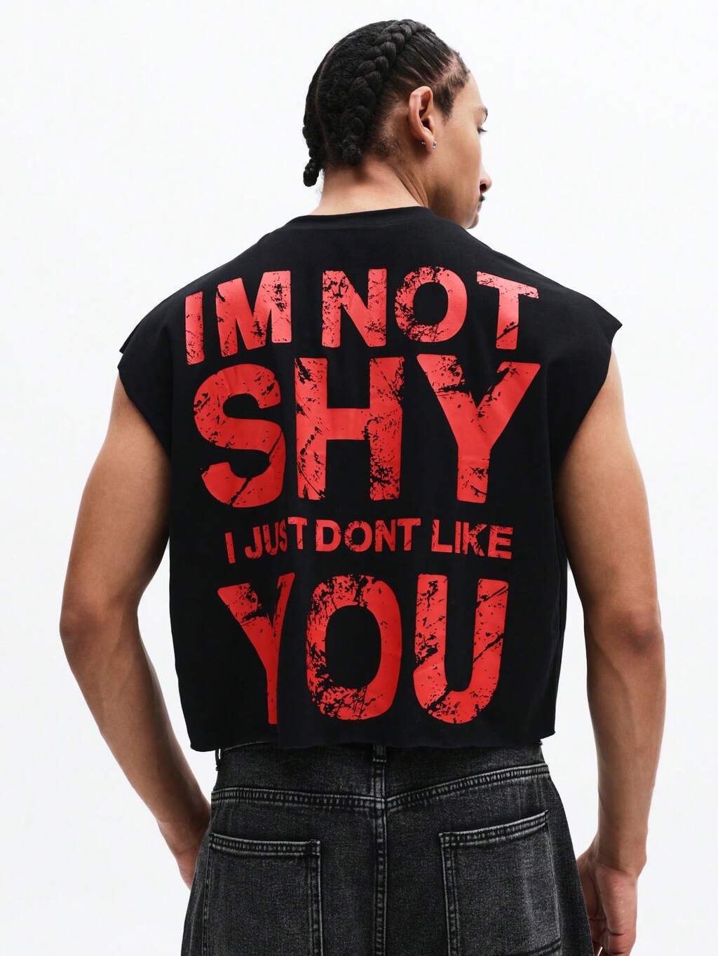 Męski bezrękawnik z wyrazistym nadrukiem na plecach, letni, swobodny, miejski styl