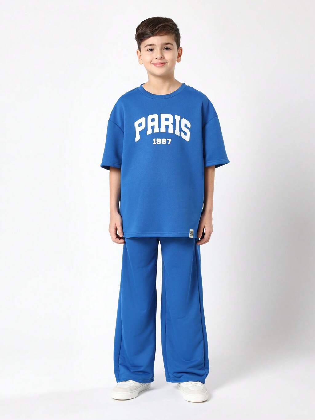 Conjunto de Camiseta e Shorts Coordenados com Estampa de Letra Oversized para Meninos, Roupa Casual de Verão para Pré-Adolescentes