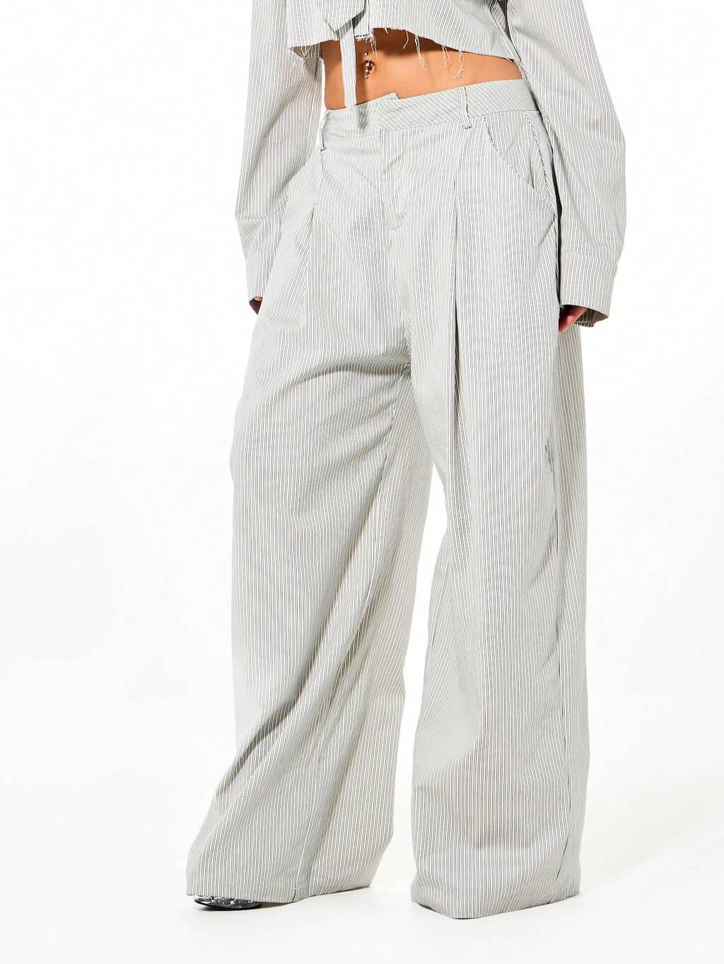 SUMWON WOMEN Calças de alfaiataria oversized com risca de giz e pernas largas, com cinto.