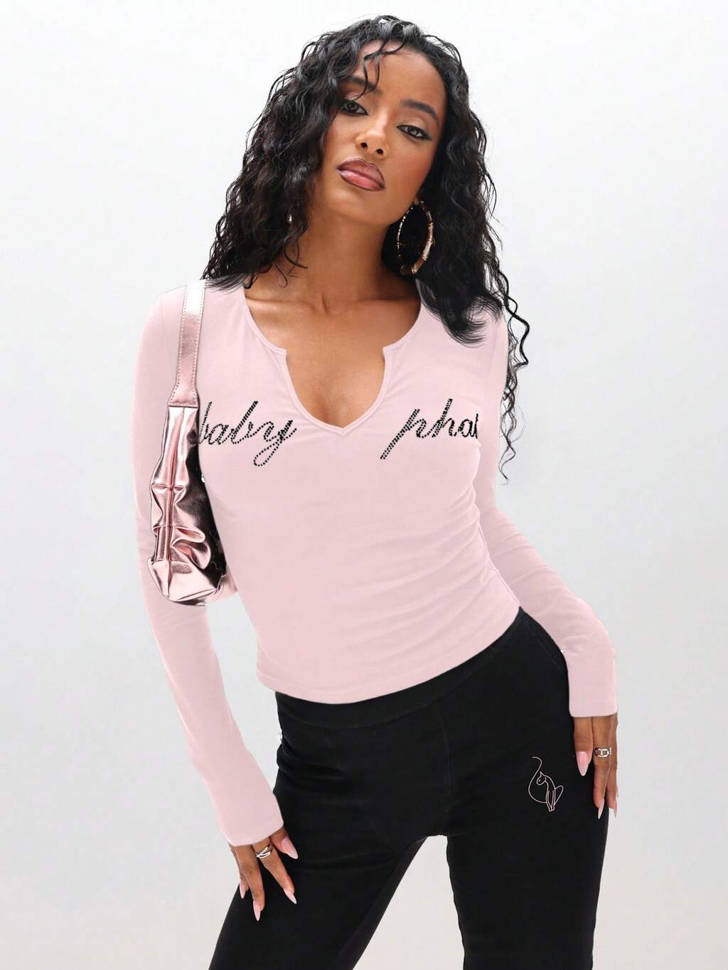 BABYPHAT Top Rosa de Manga Longa com Decote em Entalhe e Texto Bebê com Strass para Uso Casual do Dia a Dia, Plus Size
