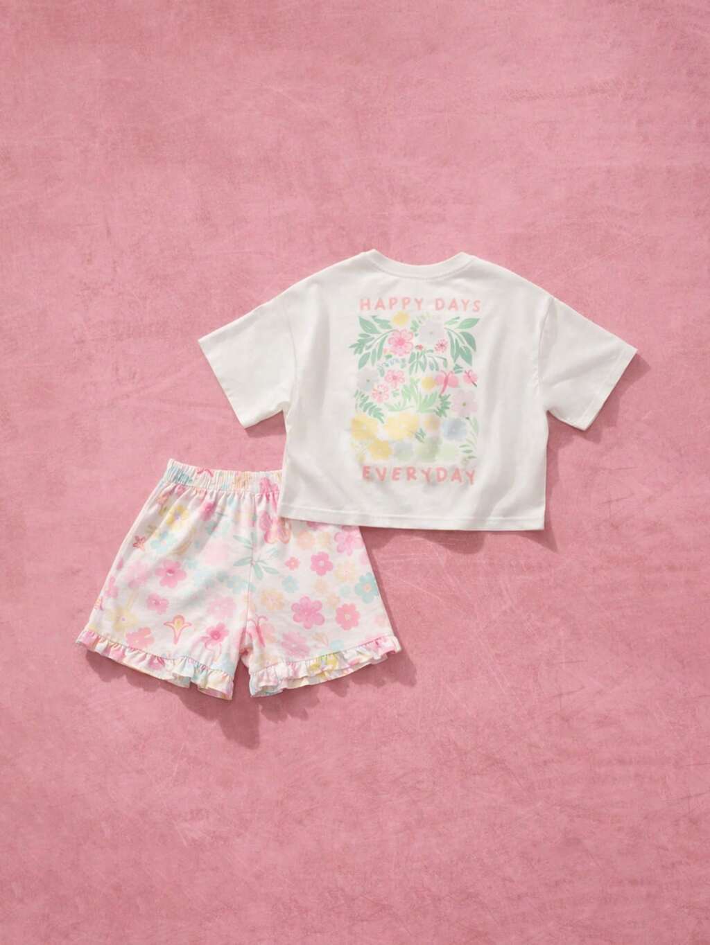 Conjunto coordenado de camiseta e shorts em tons pastel