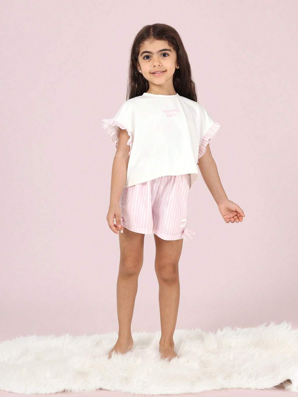 Camiseta com estampa de laço, manga curta e babados, calça coordenada