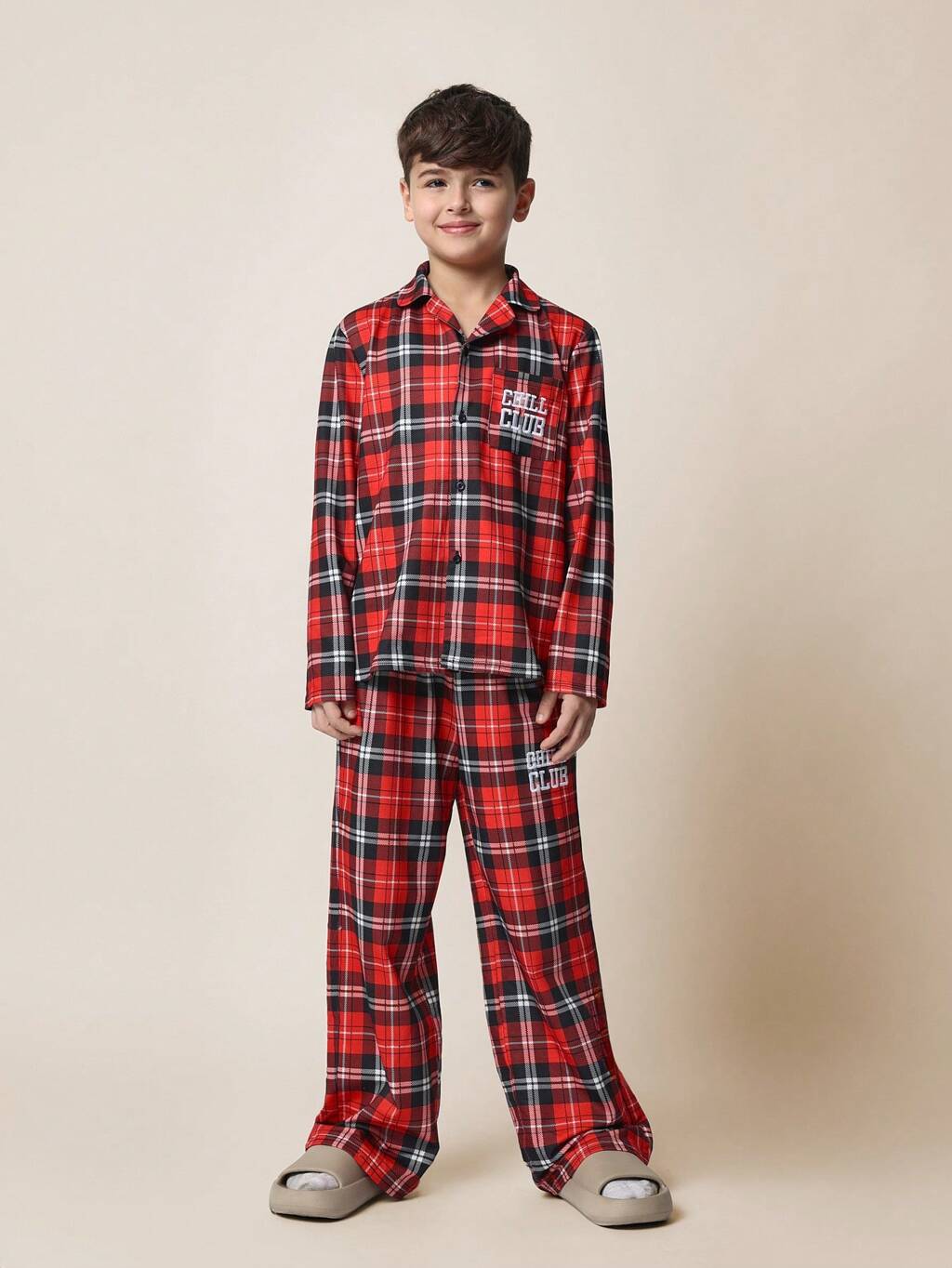 Conjunto de pijama com camisa e calça xadrez e logotipo do Chill Club