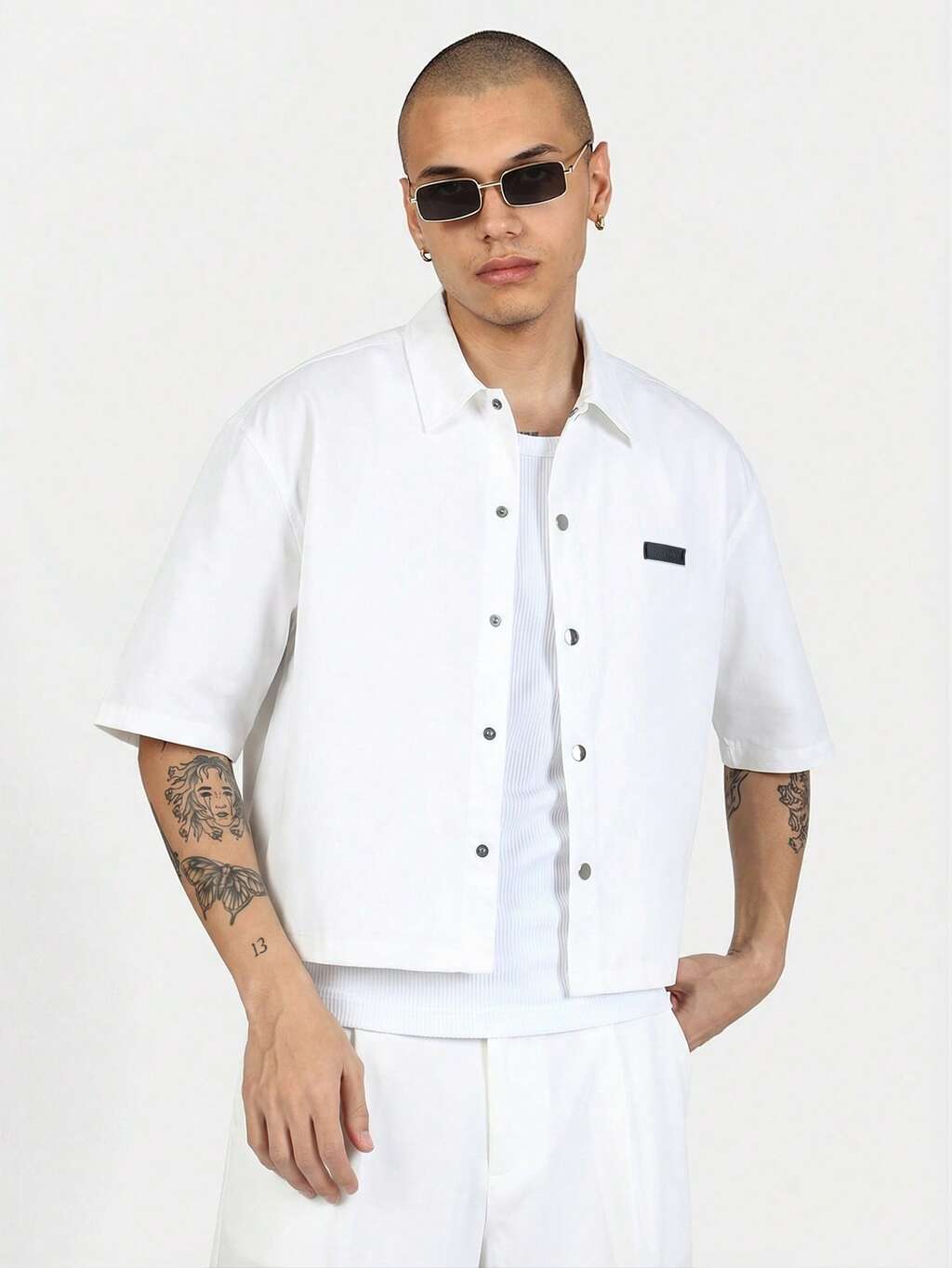 Camisa de Botão de Manga Curta Relaxada com Detalhe de Costura Contrastante e Bolso no Peito