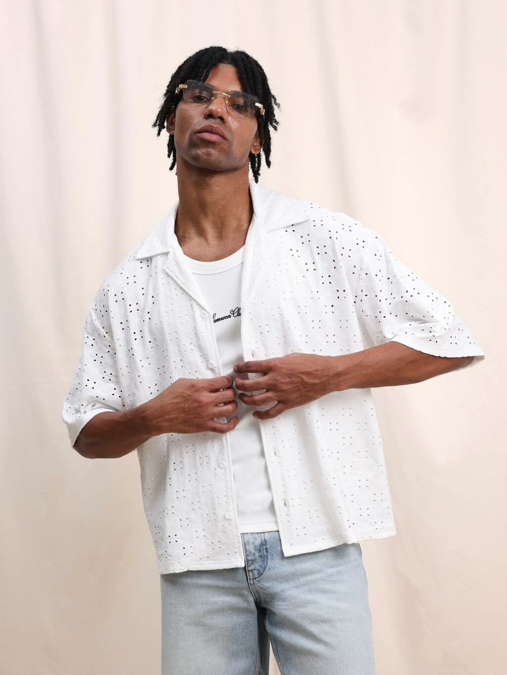 Camisa Social de Manga Curta Branca Perfurada com Detalhes em Ilhós, Casual de Verão com Gola Regular