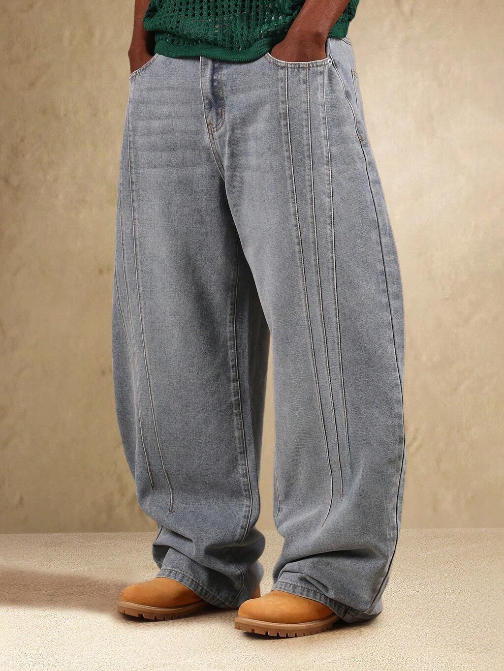 Calça Denim com modelagem balão e painéis, com costuras geométricas.