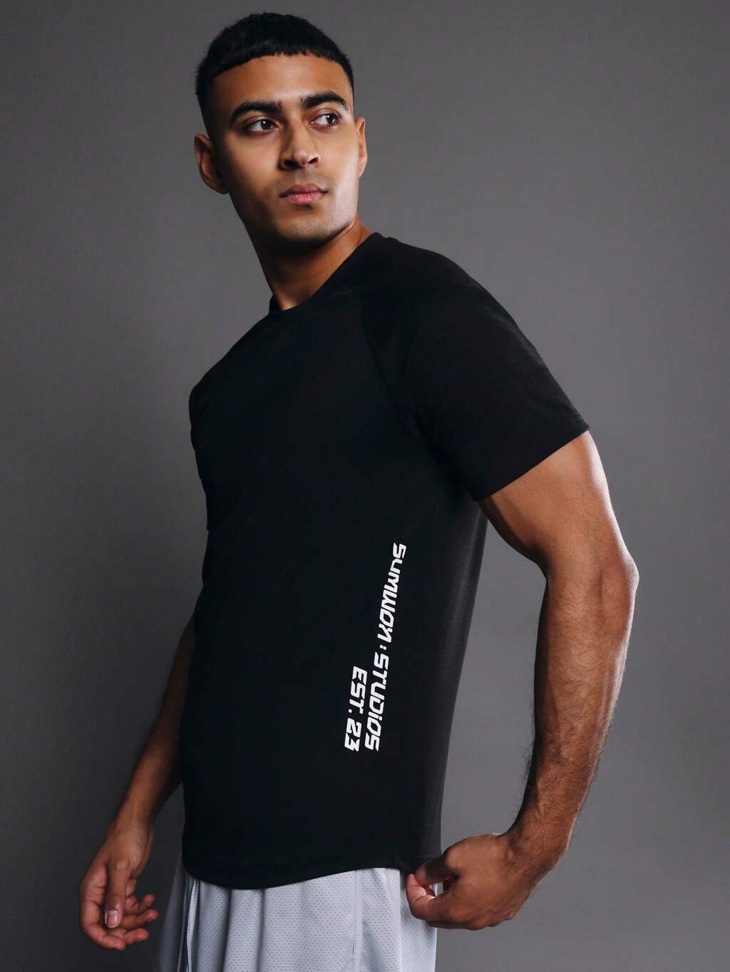 Camiseta de manga curta com gola redonda e texto lateral.