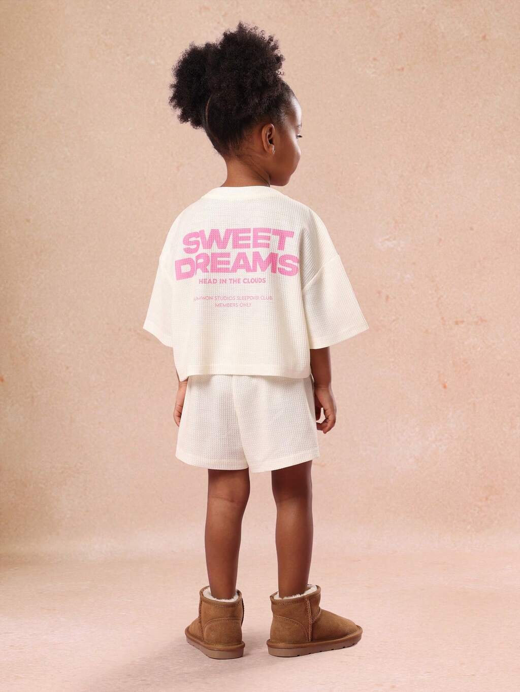 Blusa e shorts de malha waffle com texto "Doces sonhos"